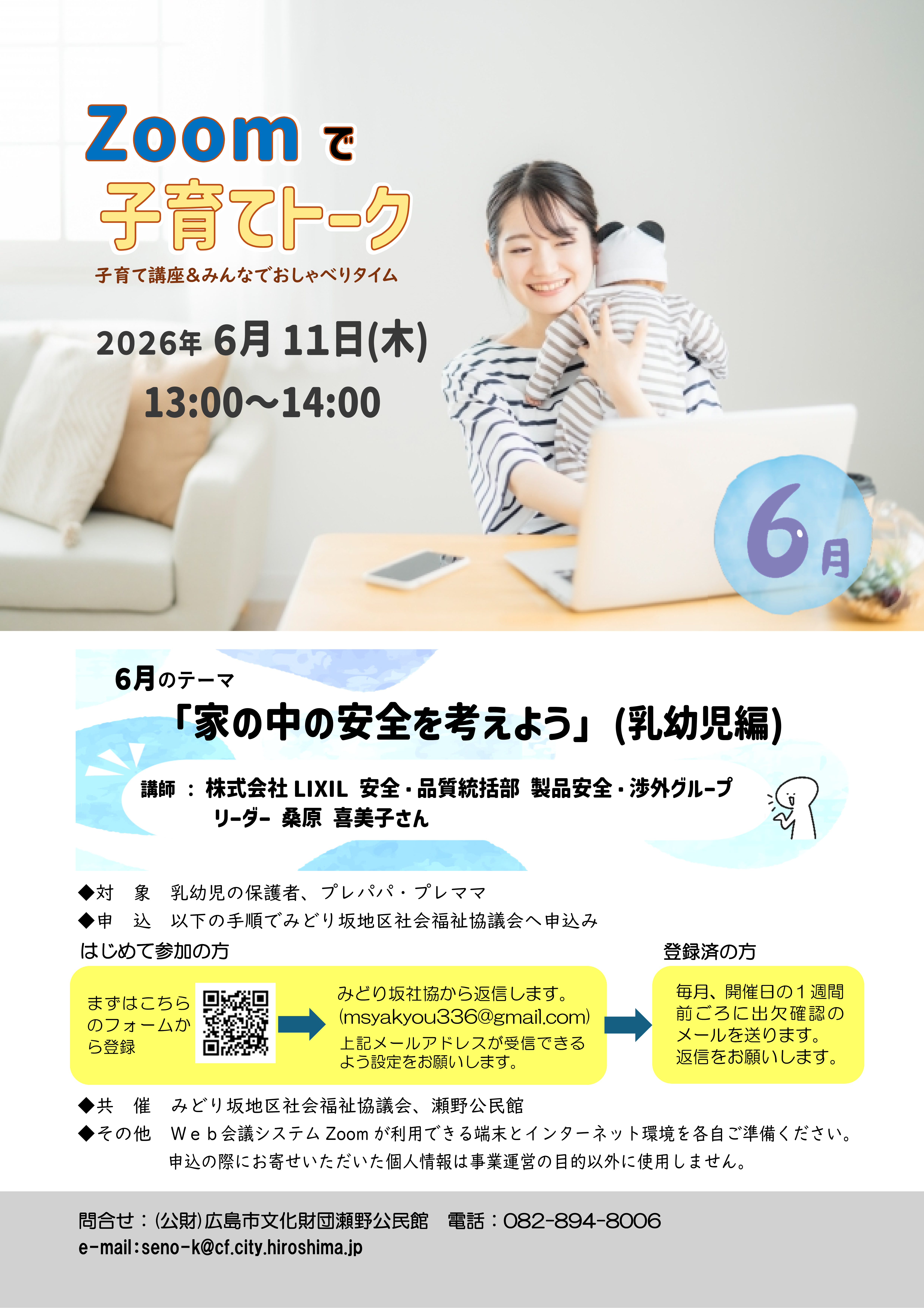 6月テーマ:「家の中の安全を考えよう」(乳幼児編) 講師 : 株式会社LIXIL 安全・品質統括部 製品安全・渉外グループ リーダー 桑原 喜美子さん (※4/26 講師を一部変更しました) |